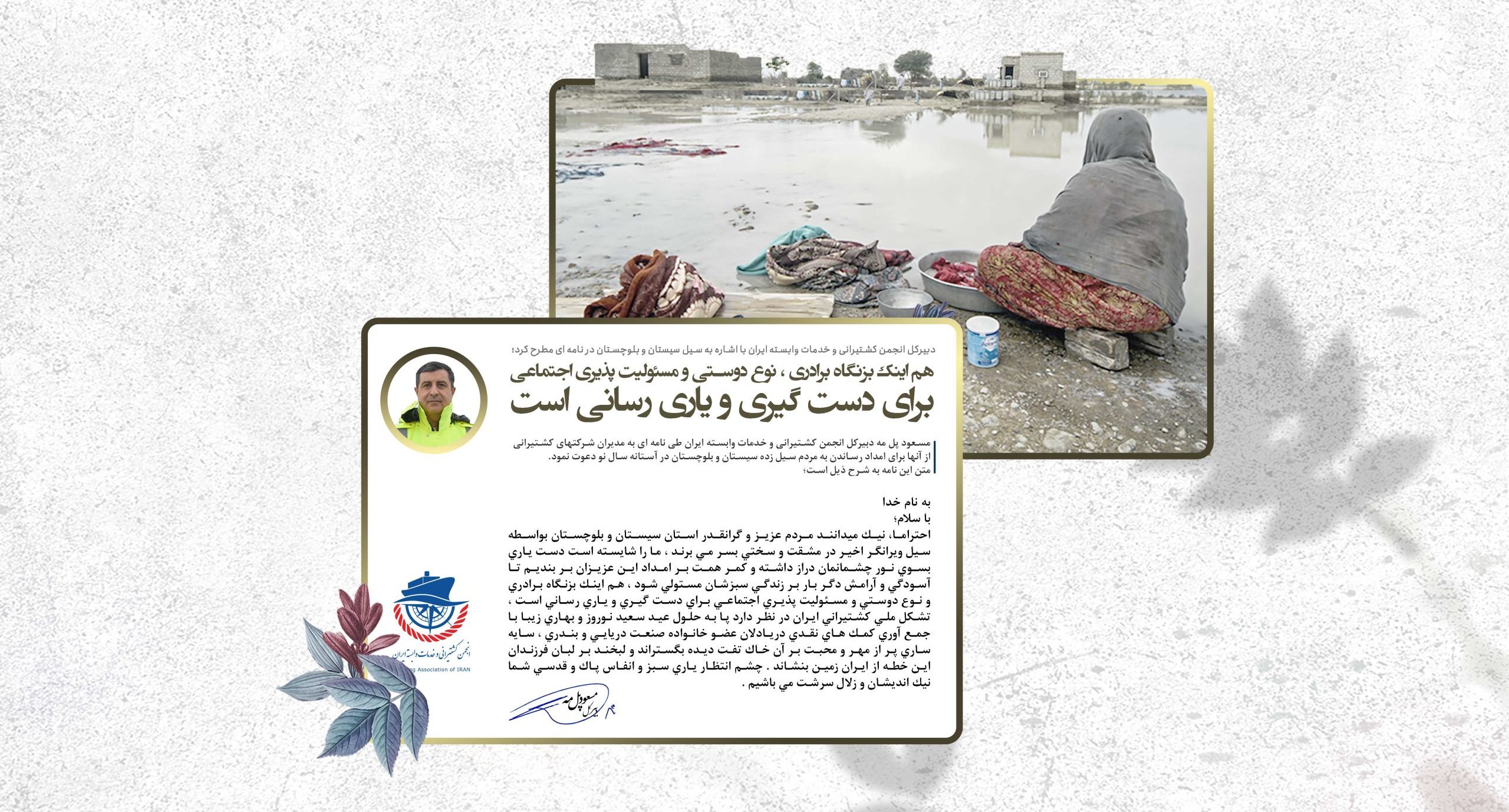 احتراما، نيك ميدانند مردم عزيز و گرانقدر استان سيستان و بلوچستان بواسطه سيل ويرانگر اخير در مشقت و سختي بسر مي برند ، ما را شايسته است دست ياري بسوي نور چشمانمان دراز داشته و كمر همت بر امداد اين عزيزان بر بنديم تا آسودگي و آرامش دگر بار بر زندگي سبزشان مستولي شود ، هم اينك بزنگاه برادري و نوع دوستي و مسئوليت پذيري اجتماعي براي دست گيري و ياري رساني است ، تشكل ملي كشتيراني ايران در نظر دارد پا به حلول عيد سعيد نوروز و بهاري زيبا با جمع آوري كمك هاي نقدي دريادلان عضو خانواده صنعت دريايي و بندري ، سايه ساري پر از مهر و محبت بر آن خاك تفت ديده بگستراند و لبخند بر لبان فرزندان اين خطه از ايران زمين بنشاند . چشم انتظار ياري سبز و انفاس پاك و قدسي شما نيك انديشان و زلال سرشت مي باشيم .