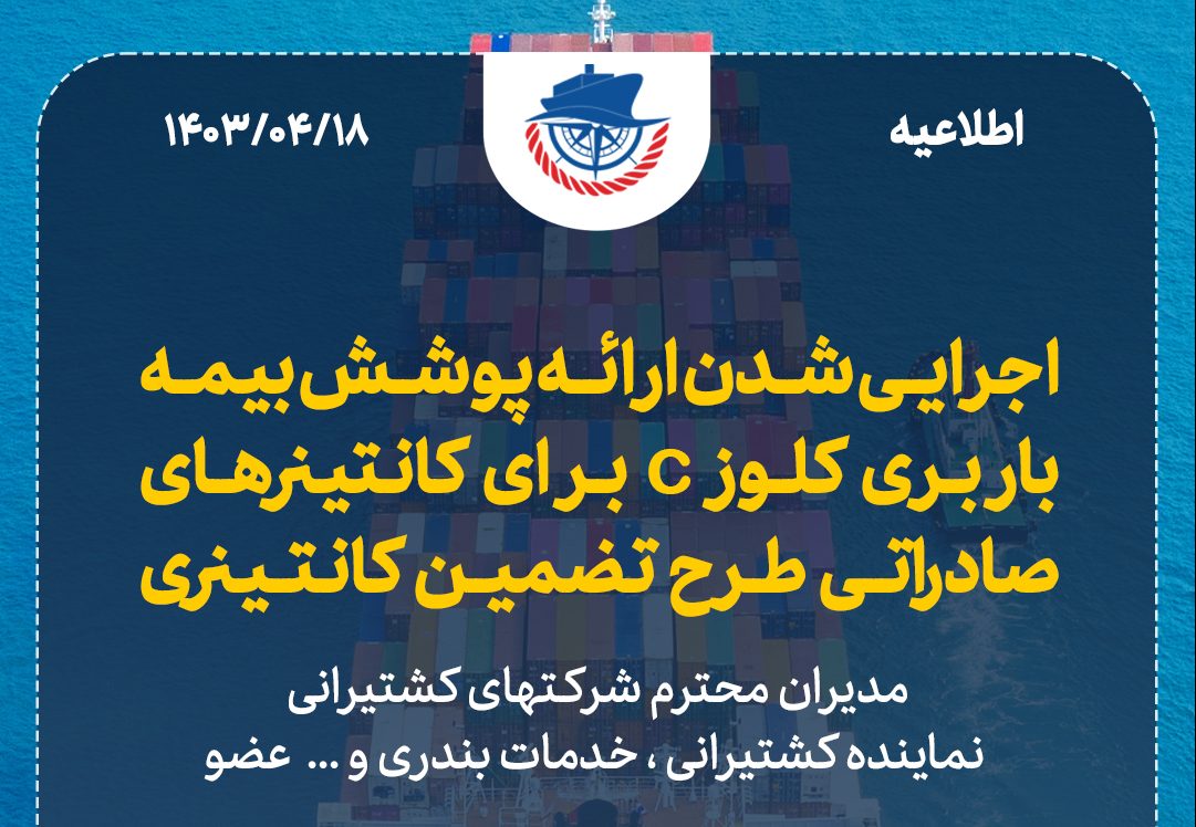 احتراماً پيرو اطلاعيه شماره 3000/03/610/ص مورخ 9 / 3 / 1402 در خصوص ارائه پوشش بيمه باربري كلوز c براي كانتينرهاي صادراتي تحت طرح تضمين كانتينري ، به استحضار ميرساند اين پوشش از 15 تيرماه سال جاري براي كالاهاي صادراتي حاوي كانتينرهاي تحت پوشش طرح تضمين تعهدات تحويل گيرندگان كانتينر در قبال مالكان كانتينر تا سقف 50 ميليون تومان ( رايگان ) اجرائي شده است . لازم به توضيح است ظرف چند روز آينده گواهي بيمه مربوطه از طريق دسترسي سيستمي در سامانه بيمه كانتينري قابل چاپ خواهد بود .