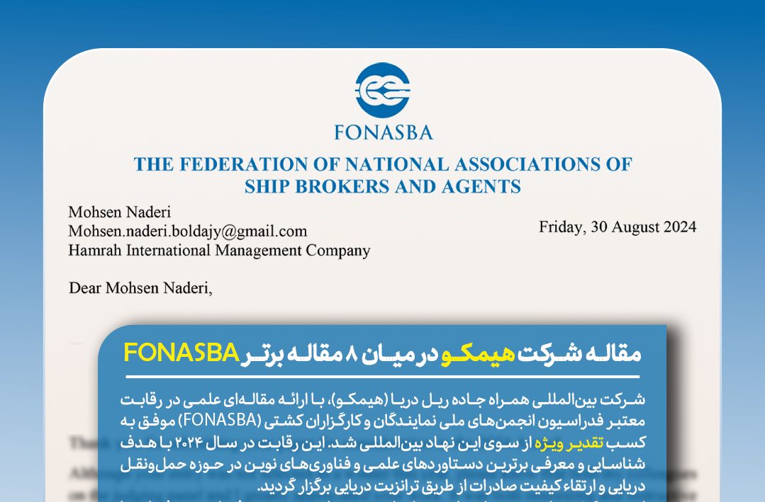 شرکت بینالمللی همراه جاده ریل دریا (هیمکو)، با ارائه مقالهای علمی در رقابت معتبر فدراسیون انجمنهای ملی نمایندگان و کارگزاران کشتی (FONASBA) موفق به کسب تقدیر ویژه از سوی این نهاد بینالمللی شد. این رقابت در سال 2024 با هدف شناسایی و معرفی برترین دستاوردهای علمی و فناوریهای نوین در حوزه حملونقل دریایی و ارتقاء کیفیت صادرات از طریق ترانزیت دریایی برگزار گردید.