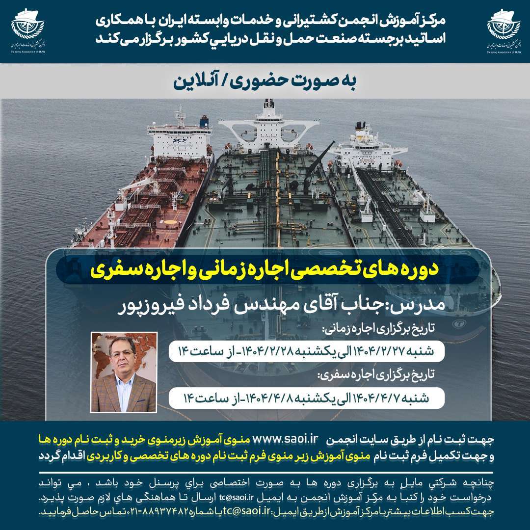انجمن كشتيراني و خدمات وابسته ايران در نظر دارد كارگاه های آموزشي« اجاره زماني» و « اجاره سفری» را به صورت حضوری و آنلاین برگزار نمايد. دامنه كاربرد دوره های مذكور علاوه بر شمول كاركنان براي كليه دست اندركاران فعاليت هاي مبتني بر صادرات و واردات كالا ( تجارت خارجي ) ضروري مي باشد.