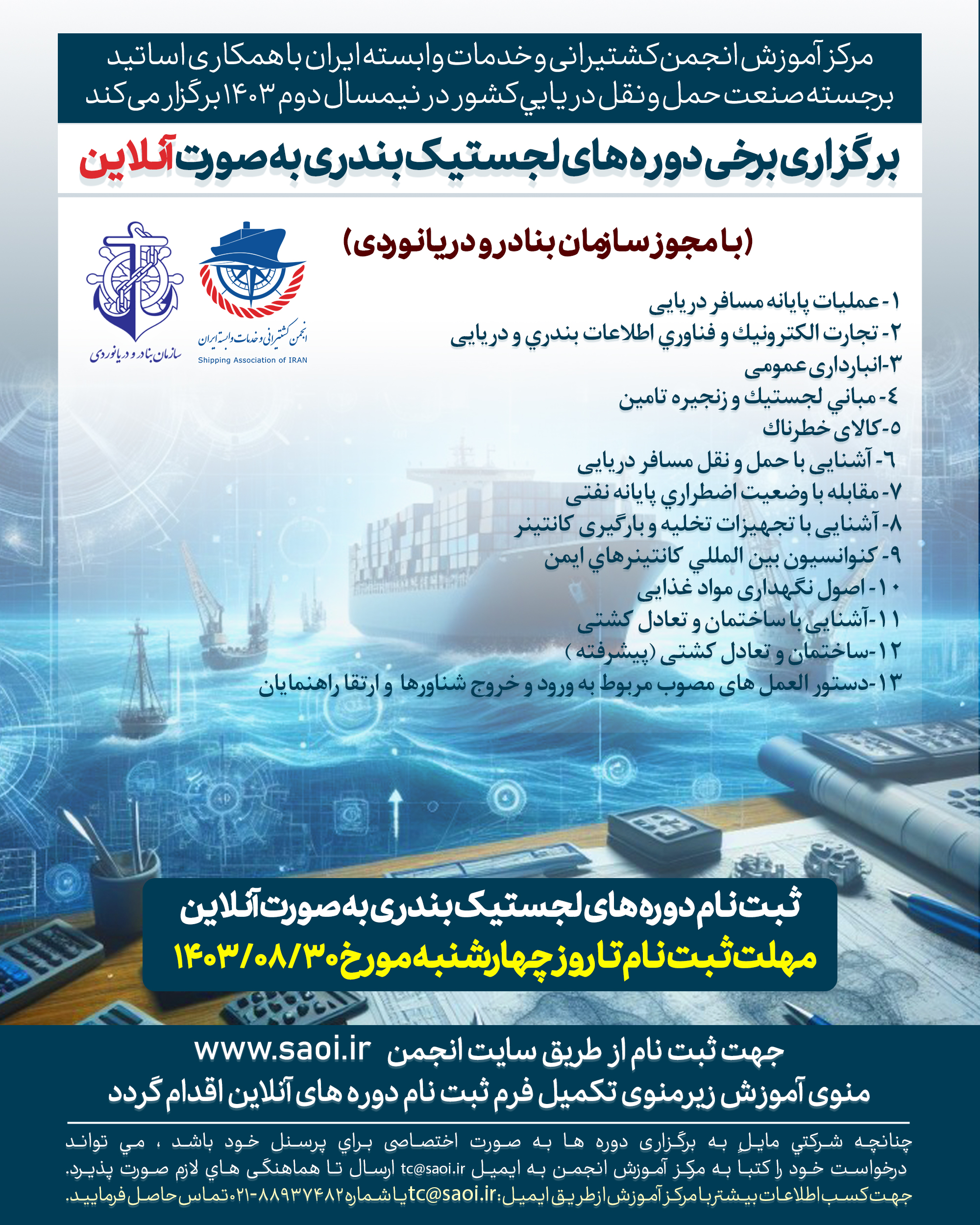 احتراما نظر به امكان برگزاري بخشي از دوره هاي لجستيك بندري ( STCP ) سازمان بنادر و دريانوردي به صورت آنلاين، به اطلاع مي رساند مهلت ثبت نام تا روز چهارشنبه 30 / 8 / 1403 مي باشد.
