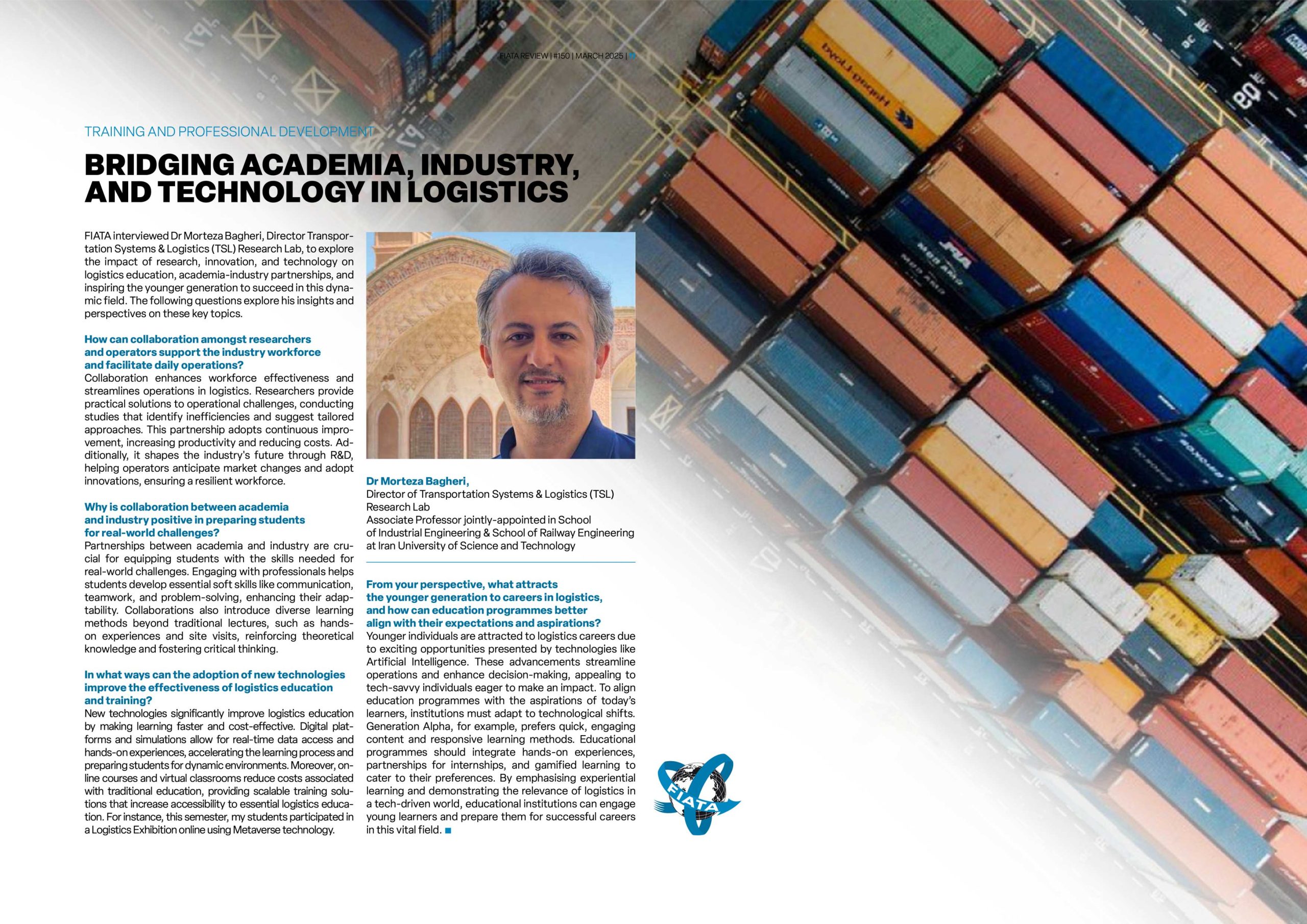 روابط عمومی انجمن کشتیرانی و خدمات وابسته ایران-* مجله FIATA در شماره ۱۵۰ خود که در اسفند ۱۴۰۳ منتشر شد، به بررسی روندهای جدید در آموزش و توسعه حرفهای در حوزه لجستیک پرداخته است. در این شماره، گفتوگویی با دکتر مرتضی باقری، مدیر آزمایشگاه تحقیقات سامانههای حملونقل و لجستیک (TSL) و استاد دانشگاه علم و صنعت ایران، منتشر شد که در آن بر نقش تحقیقات، فناوری و همکاریهای دانشگاهی در ارتقای آموزش لجستیک و تربیت نیروی متخصص تأکید شده است.