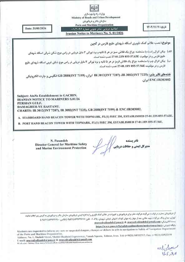 به گزارش روابط عمومی انجمن کشتیرانی و خدمات وابسته ایران- سازمان بنادر و دریانوردی سازمان بنادر و دریانوردی در راستای ارتقای ایمنی دریانوردی، از نصب و راه‌اندازی علائم جدید کمک‌ناوبری در اسکله «شهدای خلیج فارس» منطقه گچین خبر داد. این اقدام که تحت عنوان اعلامیه دریایی شماره ۰۱/۲۰۲۶ صادر شده، با هدف تسهیل تردد شناورها و پیشگیری از سوانح دریایی در بنادر جنوبی کشور صورت گرفته است.