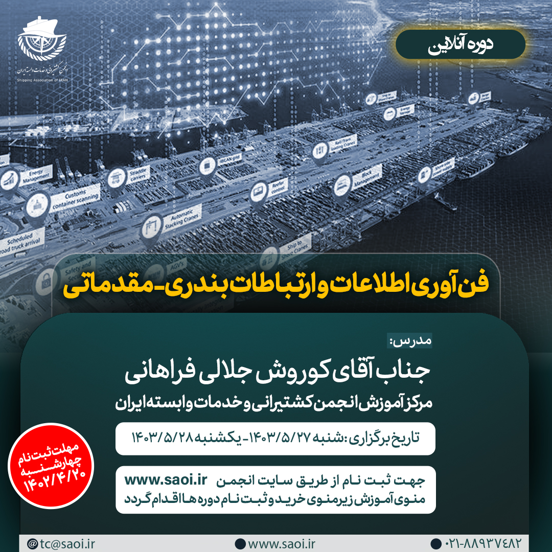 احتراماً، انجمن کشتیرانی و خدمات وابسته ایران در نظر دارد کارگاه آموزشی ” فن آوري اطلاعات و ارتباطات بندري- مقدماتي “ به صورت آنلاین را طبق دستور العمل سازمان بنادر و دریانوردی از تاریخ 27/5/1403 الی28/5/1403 برگزار نماید. دوره مذکور از دوره های عمومی لجستیک بندری بوده و حوزه کشتیرانی ، نمایندگی و بازرگانی را شامل میشود و دامنه کاربرد آن علاوه بر شمول کارکنان برای کلیه دست اندرکاران فعالیت های مبتنی بر صادرات و واردات کالا ( تجارت خارجی ) ضروری می باشد.