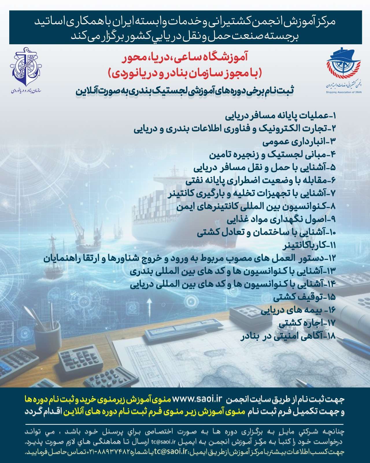 نظر به امكان برگزاري بخشي از دوره هاي لجستيك بندري (STCP) سازمان بنادر و دريانوردي به صورت آنلاين ، به اطلاع مي رساند مهلت تکمیل فرم ثبت نام از طریق لینک https://saoi.ir/15852-2/ تا روز پنجشنبه 1404/7/10 مي باشد.