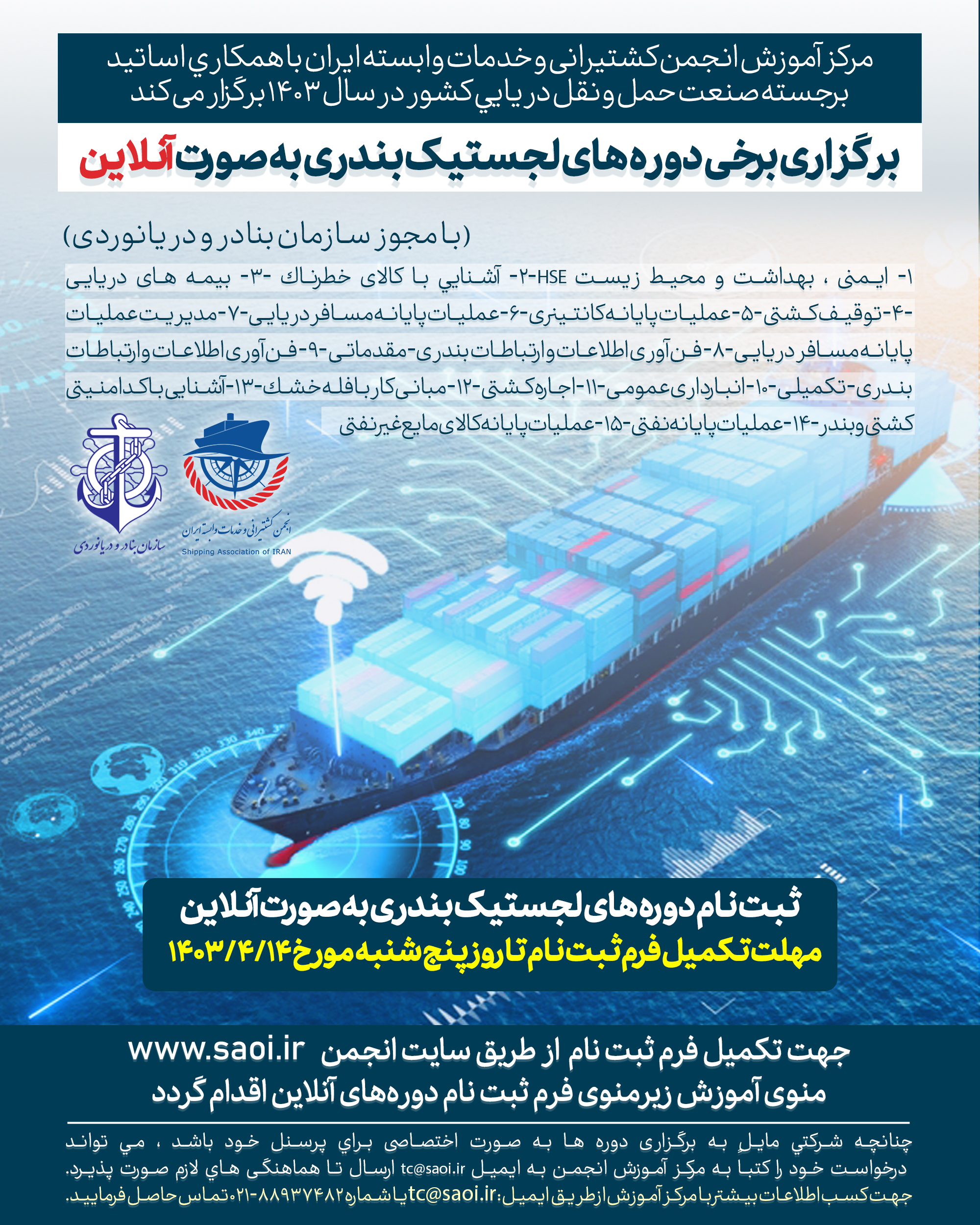 احتراما نظر به امكان برگزاري آنلاين برخي دوره ها منتهي به پايان مرداد ماه سال جاري، به اطلاع مي رساند ثبت نام دوره هاي آنلاين به شرح ذيل آغاز و مهلت ثبت نام تا روز چهارشنبه مورخ 1403/4/20 مي باشد. دوره هاي آموزشي مذكور از مجموعه دوره هاي تخصصي لجستيك بندري بوده و حوزه پس كرانه و بندر را شامل مي شود و دامنه كاربرد آن علاوه بر شمول كاركنان بندري دريايي ، براي كليه دست اندركاران فعاليت هاي مبتني بر صادرات و واردات كالا ( تجارت خارجي ) ضروري مي باشد.