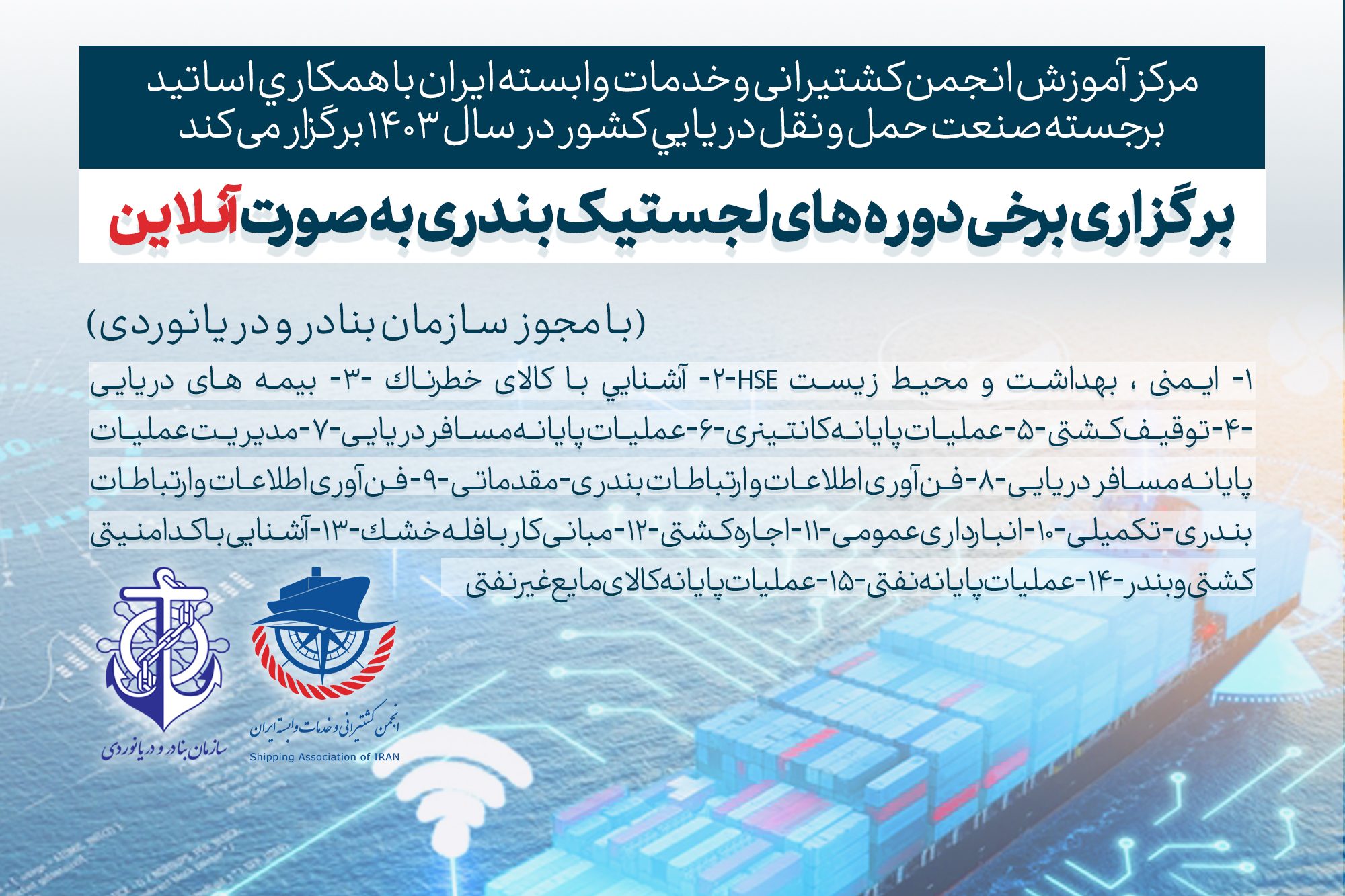 به گزارش روابط عمومی انجمن کشتیرانی مرکز آموزش انجمن امکان برگزاری برخی دوره های لجستیک بندری را به صورت آنلاین فراهم آورده است.