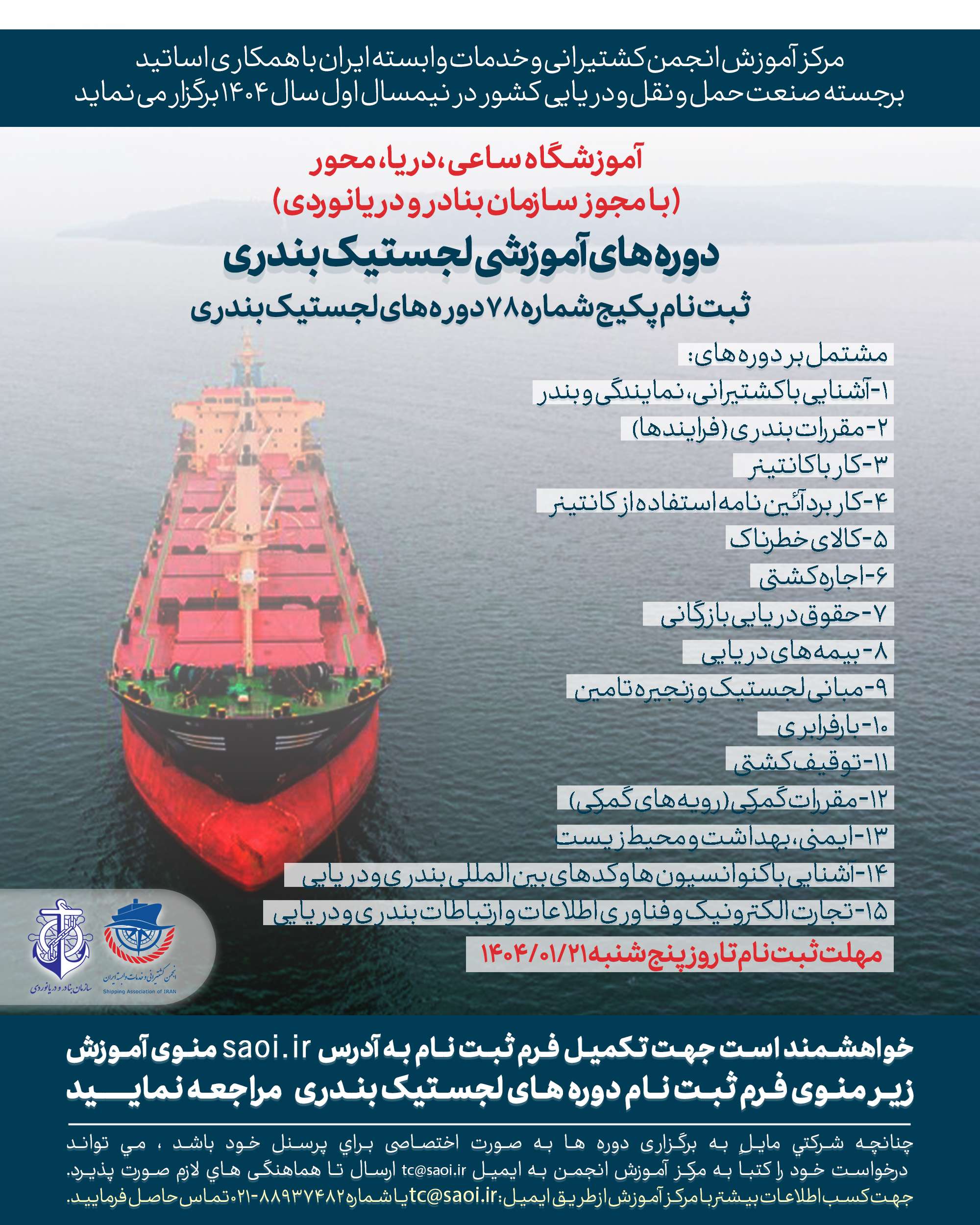 انجمن كشتيراني و خدمات وابسته ايران در نظر دارد دوره هاي لجستيك بندري مربوط به فعاليت نمايندگي كشتيراني (خدمات بندري كشتيراني) را در قالب پكيج ارائه نمايد. با توجه به دستورالعمل آموزشي مصوب سازمان بنادر و دريانوردي در خصوص دوره هاي لجستيك بندري ، كاركنان اين حوزه را ملزم نموده است تا خود را با اين دستورالعمل هماهنگ نمايند. دامنه كاربرد آن علاوه بر شمول كاركنان اين حوزه ، براي كليه دست اندركاران فعاليت هاي مبتني بر صادرات و واردات كالا ( تجارت خارجي ) ضروري مي باشد.
