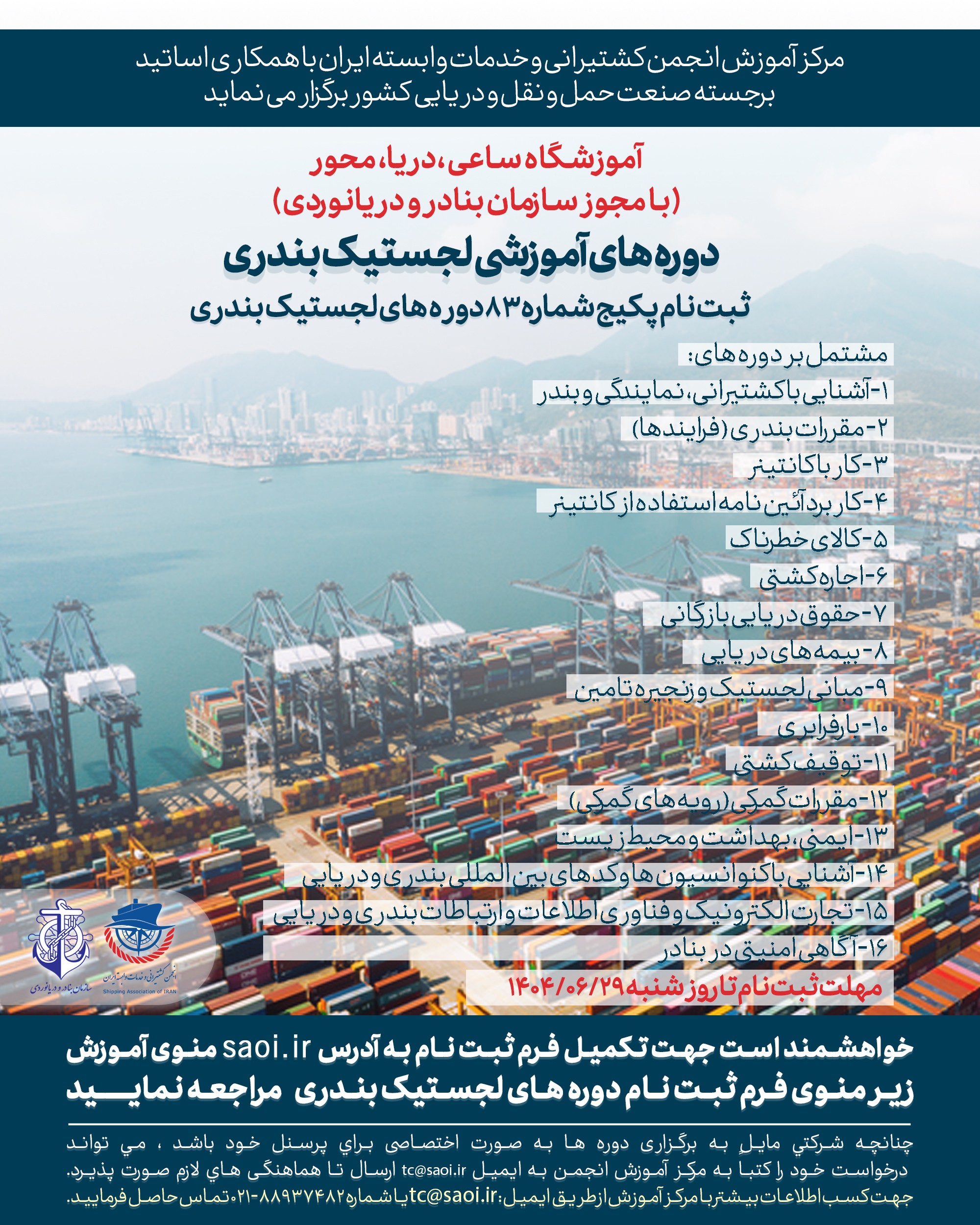 انجمن كشتيراني و خدمات وابسته ايران در نظر دارد دوره هاي لجستيك بندري مربوط به فعاليت نمايندگي كشتيرانی(خدمات بندري كشتيراني) را در قالب پكيج ارائه نمايد. با توجه به دستورالعمل آموزشي مصوب سازمان بنادر و دريانوردي در خصوص دوره هاي لجستيك بندري ،  كاركنان اين حوزه را ملزم نموده است تا خود را با اين دستورالعمل هماهنگ نمايند. دامنه كاربرد آن علاوه بر شمول كاركنان اين حوزه ، براي كليه دست اندركاران فعاليت هاي مبتني بر صادرات و واردات كالا ( تجارت خارجي ) ضروري مي باشد.