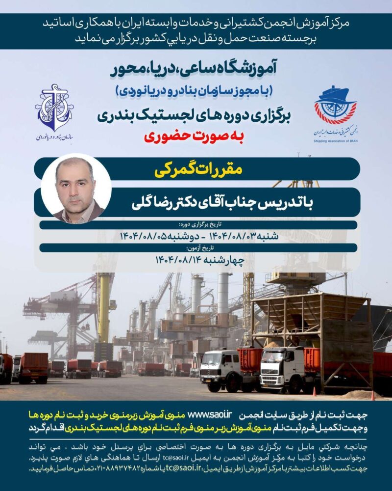 محل برگزاری دوره: مرکز آموزش انجمن کشتیرانی و خدمات وابسته ایران به نشانی خیابان ولیعصر، بالاتر از میدان ولیعصر، نرسیده به زرتشت، کوچه دانش کیان، پلاک 30