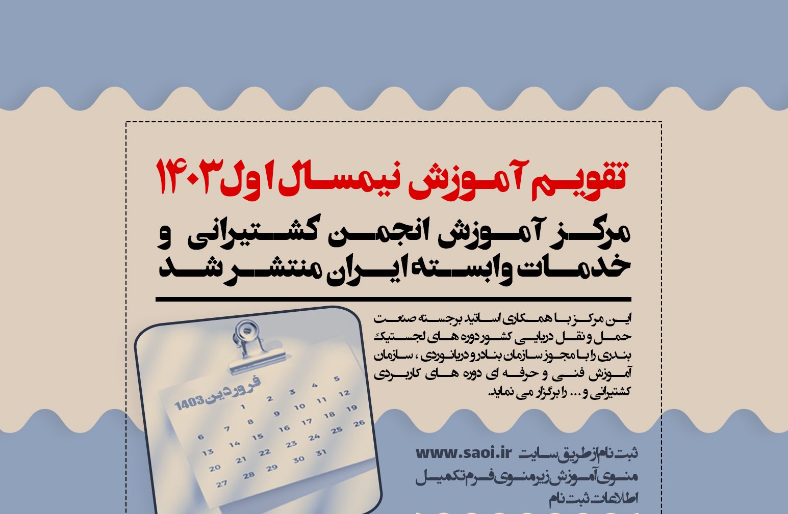 در ادامه تقویم آموزشی نیمسال اول 1403 مرکز آموزش انجمن کشتیرانی و خدمات وابسته را مشاهده می نمایید: